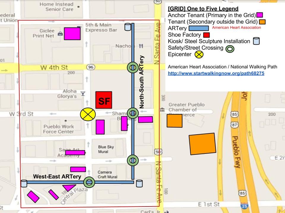 When business owners, residents and artists in the Downtown Main Street area of the Pueblo Creative Corridor met in 2013, they decided to define the focus of their creative efforts. After careful consideration and discussion, the first phase of economic redevelopment using the arts was limited to the [GRID] One to Five. This region was defined as the area within First Street (City Center Drive) to Fifth Street and from Santa Fe Avenue to Court Street. The image below is the very first mapping of the area which has been used to define the original conversation.